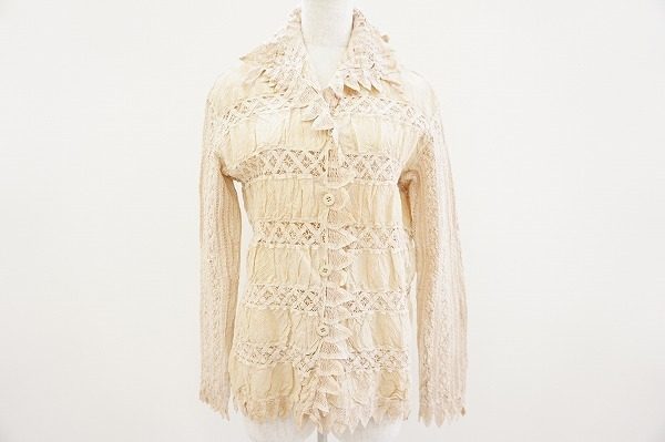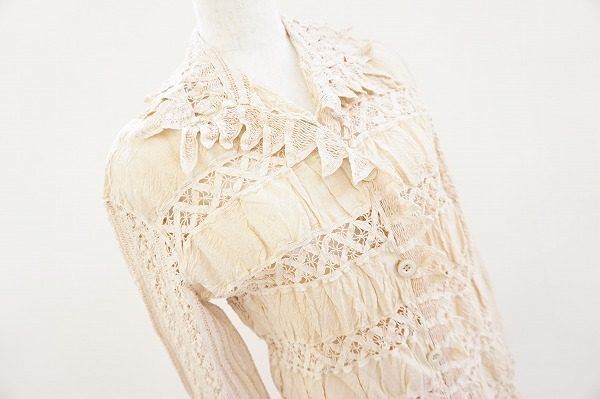 麻と格子のレース装飾をボーダー状に幾度も切り替えた身頃、フェミニンなレース素材の袖、裾から襟にかけて全体的に鱗片状のトリミングを施した上品なデザインです。