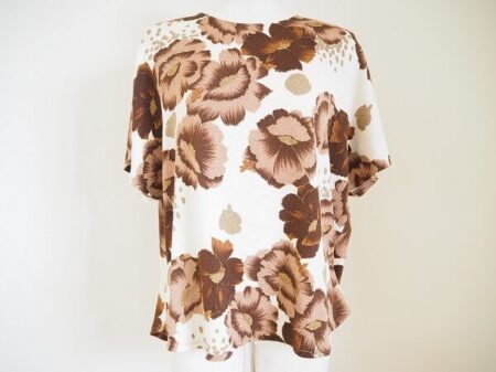 詩仙堂の夏物カットソーをお客様からお譲りいただきました。しなやかなちりめんの肌触りをカジュアルに日常的に味わえるトップスです。手染めならではのグラデーションが美しく大人女性にピッタリ。落ち着いた色味でも白に茶色の大きなフラワーモチーフがアクセントになっています。購入してすぐにでも袖を通したくなる1枚ですよね。