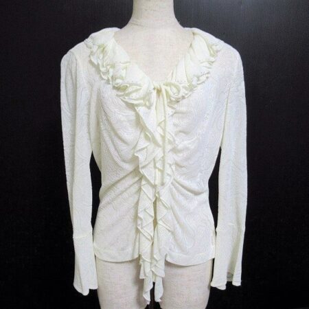 伊太利屋のカーディガンを出張買取ご利用のお客様より買取しました。白ですっきりした印象を残せるだけでなく、女性で多い上半身の華奢さをカバーできるフリルが大胆なのも嬉しいポイント。柄等はないので、清潔感を出しつつ控えめさもほどよくあります。