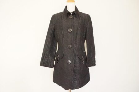 ウエストが絞られたシルエットが綺麗なブラックのコート、ボタンが大き目でアクセントになります。冬場のコーデにコートは欠かせませんので是非お手に取ってみて下さい。
