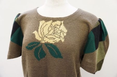 トップスはバラモチーフが大胆なアクセントになっており、袖のマルチカラーチェックが小さなアクセントと、個性を控え目に発揮できる一品です。