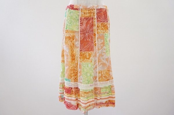 今回はこちらのミラショーンのスカートをご紹介します。赤やオレンジ・グリーンなどがとても鮮やか。ガーベラなどのお花模様が入った色とりどりの生地をパッチワークのようにつなぎ合わせていて、とても珍しいです。