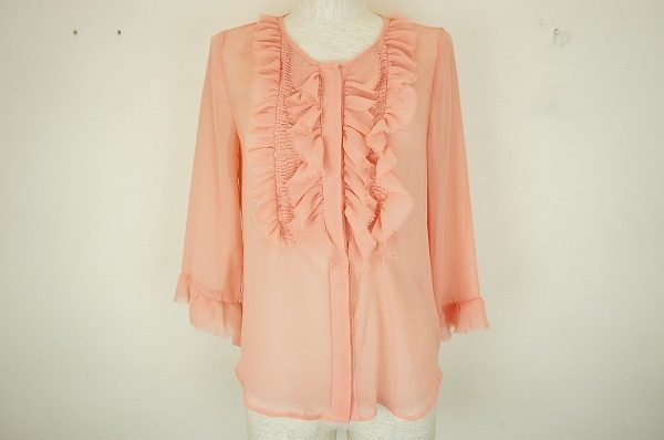 こちらのシャツブラウスは優しいピンクにフリルが可愛らしいアクセントとなっており一枚で着ても素敵ですが、ジャケットのインナーとして着て頂くと