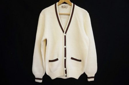 オフホワイトのカーディガンに、グッチ定番のシェリーラインがあしらわれたニットカーディガン。