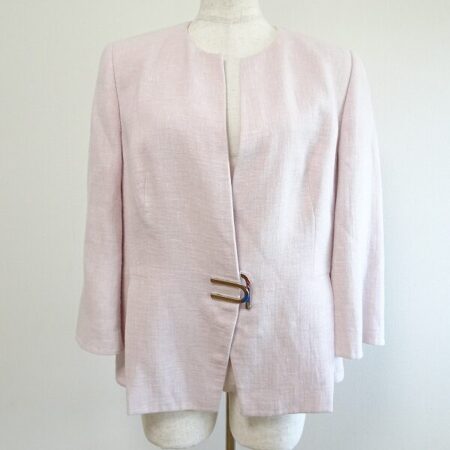 アクリスのジャケットを買取しました。聡明なデザイン、柔らかく優し気なピンクがとにかく可愛い1点です。ノーカラーデザインがより優しい印象に仕上げてくれます。七分袖でスッキリさもあります。