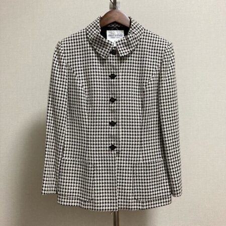 出張買取にてミスアシダのジャケットを買取しました。千鳥格子でモノトーンながらも可愛らしさが詰まったジャケットです。襟も女性の柔らかさを表現していますし、裾が広がっていて可愛らしさが詰め込まれたアイテムです。