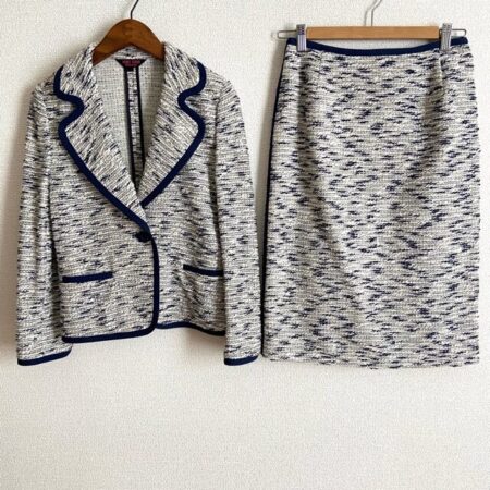 出張買取にてユキトリイのスカートスーツを買取しました。サイズは38です。白と紺色でまとめられていますが、適度なにぎやかさがあり綺麗に着ていただけます。