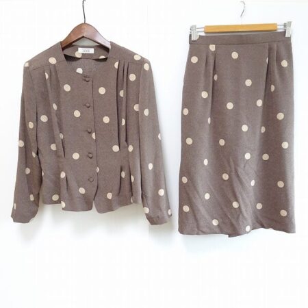 三年坂のセットアップを買取しました。買取方法は出張買取サイズはMです。茶色にドットという可愛らしい雰囲気が魅力。ノーカラーなのでさわやかに清楚な雰囲気も出していただけます。