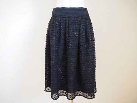 可愛らしさと上品さが同時にゲットできるデザインが豊富なユキトリイ。当店ご利用のお客様より出張買取にて買取したスカートをご紹介いたします。クールな黒の中にも程よく眩しいスパンコールが豪華に仕上げてくれるスカート。お色物のトップスや豪華な絵柄が特徴的なトップスに合わせるのもおすすめです。
