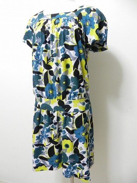 こちらのワンピースもブルーとイエロー使いがとても美しいですね。大胆な花柄ですが、パフスリーブや胸元のギャザーが柔らかな女性らしさを演出します。