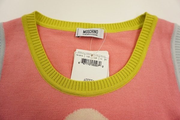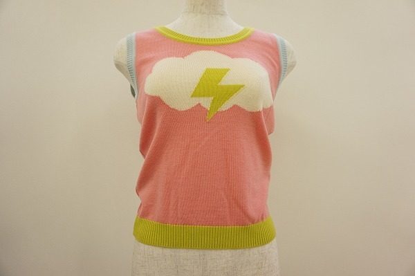 今回ご紹介させていただくのは、モスキーノのノースリーブのニットになります。フロント部分には、雲とカミナリが大胆にデザインされており、バックには”SUNNY DAY”のロゴが施されています。こんな斬新な発想は、モスキーノならではと言えるでしょう。思わず笑みがこぼれてしまう可愛らしいニットです。