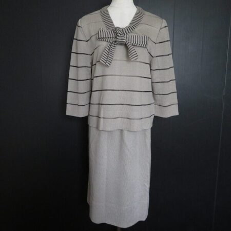 甘すぎないリボンが特徴の斉藤都世子のセットアップ。出張買取ご利用のお客様より買取しました。ボーダーも強すぎないので程よく存在感を出し綺麗めに着ていただけます。暗すぎない落ち着いた色でどんなお洋服にもぴったり。