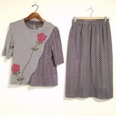 斉藤都世子のセットアップを買取しました。グレーと白をベースにしドットとボーダーを掛け合わせた珍しいアイテムです。意外にもよくマッチし可愛らしくまとまっています。赤色もポイントとなりスマートさもアップしますね。
