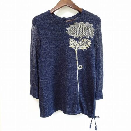 斉藤都世子のセーターを買取しました。紺×ラメの可愛さ爆発のニット。大きめのひまわりも綺麗に咲き誇ってポイントとなります。チュニックのようにしてパンツと合わせても素敵ですね。