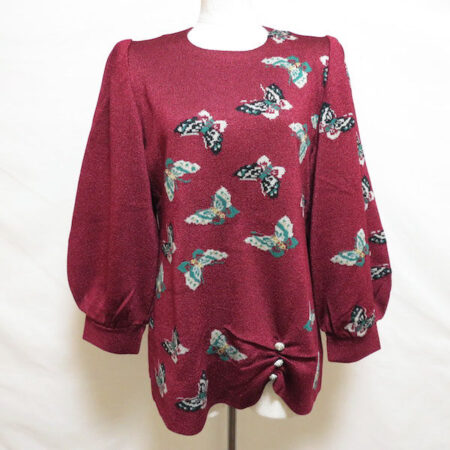 斉藤都世子のセーターを買取しました。出張買取です。心を和ませてくれるえんじ色がとにかく素敵。自然な雰囲気の蝶にも独特の世界観があり、引き込まれてしまいそうですね。