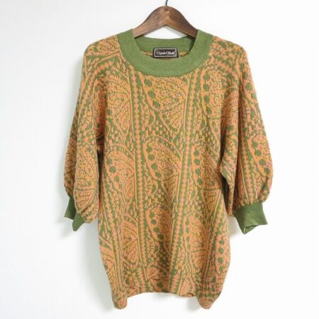 出張買取ご利用の70代女性のお客様より、斉藤都世子のニットを買取しました。明るいオレンジと若草色が見事に合った1点。くるっとしたお袖も可愛らしさが詰まっています。