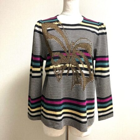 どこかさりげなさもあり、インパクトもしっかりある蝶のモチーフが印象的な斉藤都世子のニット。色使いもカラフルで素敵です。出張買取ご利用のお客様より買取しました。細かいボーダーにもこだわりを感じます。