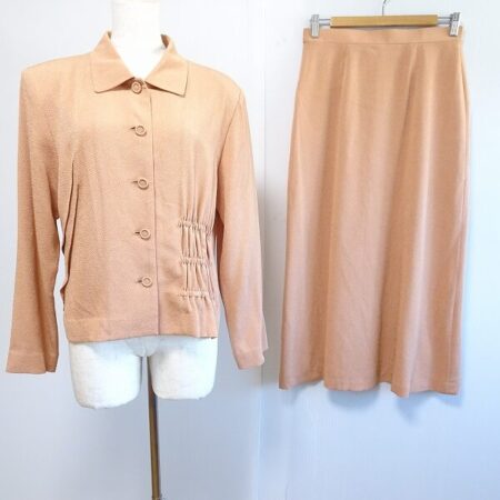 三年坂のスカートスーツを買取しました。ご利用方法は出張買取です。スーツ類には珍しいオレンジ色。柔らかいテイストなので着やすいのではないでしょうか。いい具合に明るさを出していただけて一味違ったおしゃれを楽しんでいただけます。