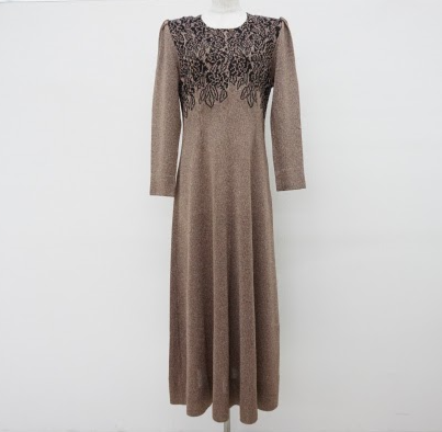 柔らかい色味のブラウンのマキシ丈フレアニットワンピース。胸元にワンピースと同系色の色味で刺繡がほどこされ1枚で着ても素敵な印象にしてくれます。柄は胸元で視線が上にいき低身長な方でもスタイル良く演出してくれます。落ち着いた雰囲気と共に優しさと品を湛えた素敵ワンピースは着心地抜群でいて長く愛用出来るお品物です。これから本格的に寒くなるときにお洒落を楽しくさせてくれるお品物です。