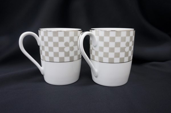 こちらのペアカップは一見、市松模様のようですが、中にお花のような柄もありカッコ可愛いデザインとなっています。