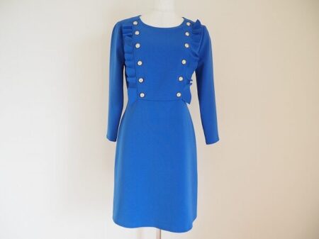 華やかさと落ちつきを同時に出してくれるのがピンコのお洋服の特徴です。しまりのある雰囲気を感じられる色鮮やかなワンピースを出張買取ご利用のお客様より買取しました。金ボタンも綺麗なブルーとよく合っており豪華さを出してくれていますね。1枚で高貴なコーディネートが叶います。