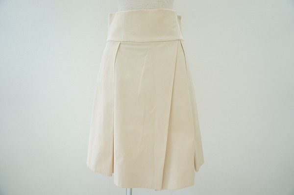 今回、入荷しましたのはこちらのスカートです。カラーは、ほんのりピンクの効いたベージュ。やさしさと気品があり、色の白い女性を美しく見せるのに効果的なカラーです。やや幅の広いウエストはハイウエスト仕様なので、下にゆるやかに広がっていくシルエットとメリハリがあり、見た目のスタイルアップが期待できます。スカート部分は、フロントはスッキリと見えるよう、バックはふんわりと動きが出るよう、プリーツと生地の流れでデザインされています。