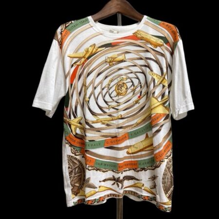 エルメスのカットソーを出張買取ご利用のお客様より買取しました。白に煌びやかな色味がマッチしたお洋服です。適度な光沢感もゴージャスさを作り上げてくれていますね。