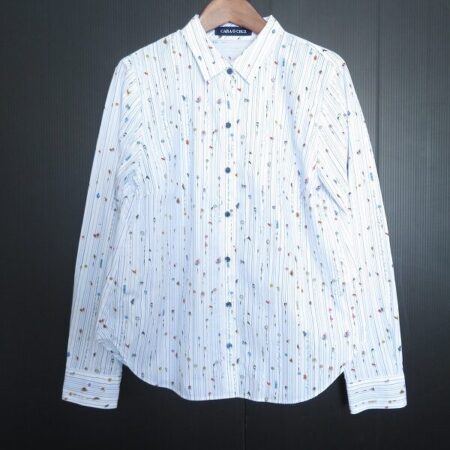 キャラオクルスのシャツを出張買取しました。白の輝きの中にストライプやシュッとした柄が煌めくように存在する1点。爽快感ある感じに仕上げてくれます。ハーフパンツなどにも合わせたいですね。