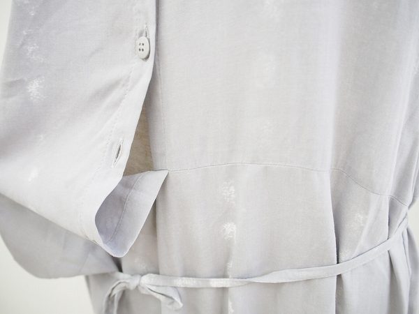 アシンメトリーで袖の長さも左右で異なり、ウエストは右側だけボタンを掛け違えた様にデザインされています。一見上級者向けのアイテムに見えますが、ワンピースなのでこれ一枚でコーディネートが完成する便利なアイテムです。