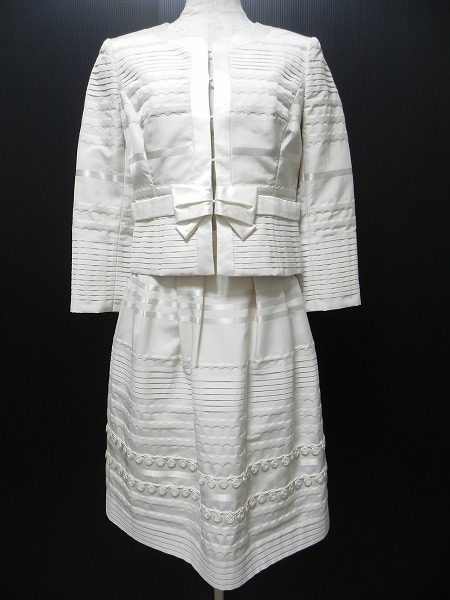 真っ白のノーカラージャケットとふんわりスカートという王道コンサバスタイルです。気品にあふれ可愛らしくどこから見てもお嬢様ファッションです。織り模様として見えるストライプ部分に光沢があるのがまた素敵ですね。晴れやかな席にぴったりです。