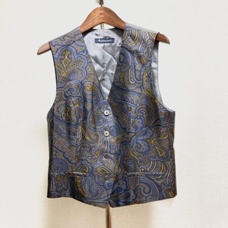出張買取においてアクアスキュータムのジレを買取しました。ペイズリーのゴージャスながらも他と調和する柄が素敵。デザインクールでかっこよく着ていただけるかと思います。