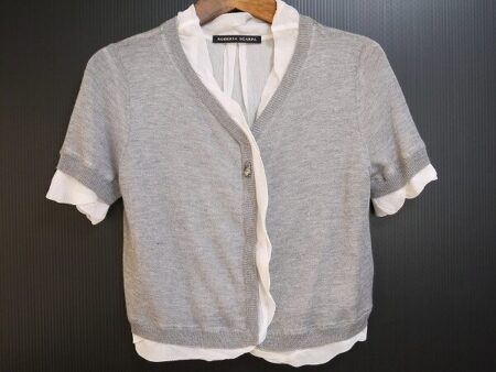 シフォンのブラウスにニットカーディガンを重ねたようなユニークなデザインのカーディガンです。