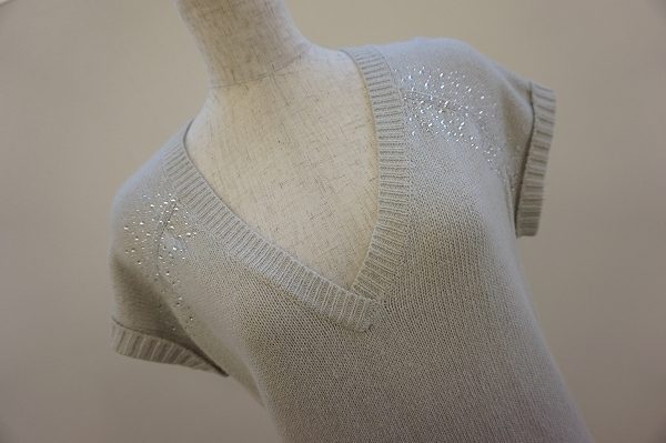 ショルダーやポケット部分にラインストーンがあしらわれ、とても華やかでエレガントです。ネックラインがVネックになっており、袖も半袖タイプですので、インにカットソーやシャツを合わせたりとお洋服でも様々な着こなしが楽しめます。
