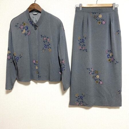 出張買取にて買取したセットアップ。ブランドは三年坂です。濃いめのグレーにたおやかなお花がさりげなく咲くお洋服。トップス部分はスタンドカラーデザインですのでどこかカッコよく仕上がります。