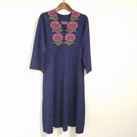 出張買取にて斉藤都世子のワンピースを買取しました。紫色でシックにまとまります。首周りの可愛らしいお花も際立ち程よいおしゃれ感と清潔感を維持してくれます。体を包み込んでくれるような上品シルエットもいいですね。