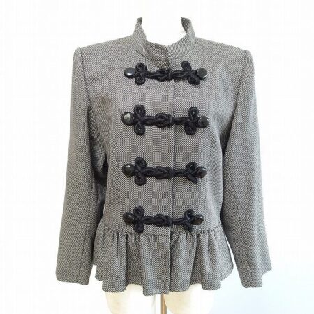 イヴサンローランのジャケットを買取しました。シルク混合です。スタンドカラーがかっこよく締まりある雰囲気にしてくれます。裾はフリルが効いていて、程よい可愛らしさも忘れません。