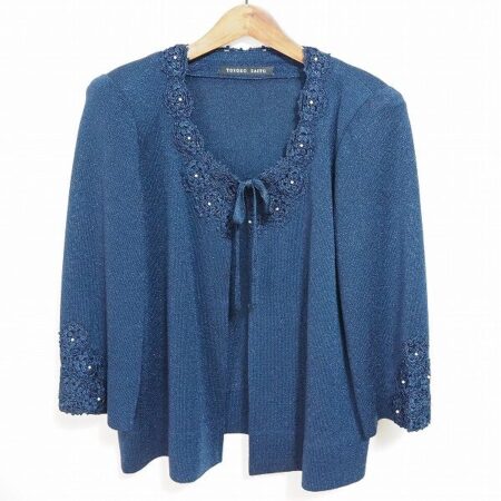 出張買取で斉藤都世子のカーディガンを買取しました。ガーリーな印象ですが濃いめの紺で大人っぽく仕上がっています。リボンや花モチーフのバランスも絶妙で上品です。