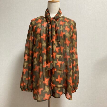 レリアンのシャツを出張買取ご利用のお客様より買取しました。緑系とオレンジ系のバランスがかっこいいシャツ。ふわりとしたデザインも癖になります。ワイドパンツやマーメイドスカートを合わせてもいいですね。