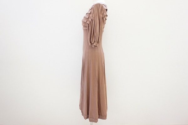 こちらの5分袖の淡いブラウンのニットワンピースは、ディテールに上品な遊び心のある、デザイン性の高いアイテムとなっています。