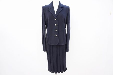 セントジョンのスカートスーツを出張買取にて買取しました。人気カラーのネイビーが品の良さと聡明さを感じさせるスカートスーツです。スカート部分はプリーツになっているため、どこか優しく柔らかさも加えられるのが嬉しい1着です。明るいお色味からシックな柄物まで合わせられるのもオススメポイント。お好きなコーディネートをお試しください。