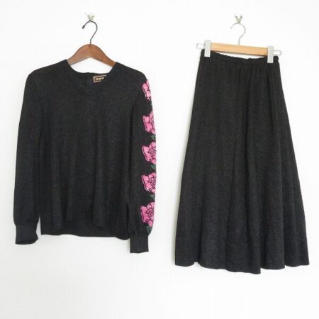 出張買取で斉藤都世子のセットアップを買取しました。黒に綺麗なバラが咲いたセットアップ。真ん中でなく袖の一部分というのがさりげなくて程よいバランスです。スカートラインも綺麗ですね。