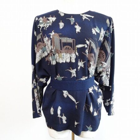 詩仙堂のカットソーを常連のお客様から買取しました。紺色に人柄がついたお洋服です。ストーリー性も感じられるのでずっと見つめ続けてしまいそう。スタイルよく着られるスマートなパンツからデニムまで幅広く合わせていただけます。