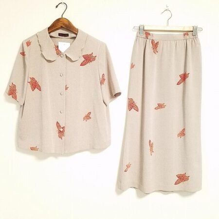 詩仙堂のセットアップを出張買取ご利用のお客様より買取しました。明るめのグレーに蝶々柄が美しいセットアップです。襟もしっかりあるシャツですのでカッコイイ雰囲気も作り出すことができます。