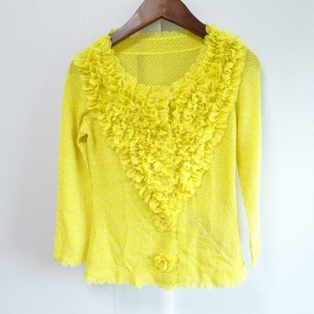 出張買取でノコオーノのカーディガンを買取しました。38サイズのお品です。ずっと眺めたくなるようなビタミンカラーの黄色。装飾も大胆で見て触れてゴージャスな気分を味わえます。