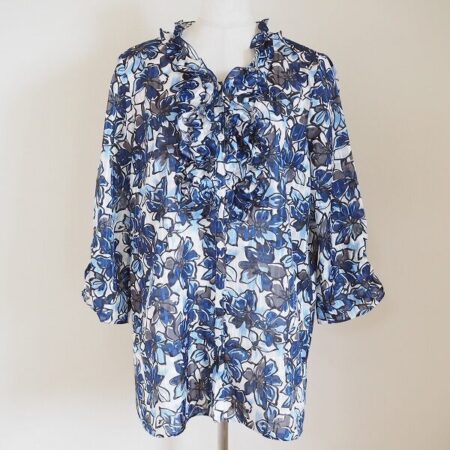当店リピーターのお客様よりレリアンのブラウスを買取しました。青、白、黒、花がおしゃれにミックスされています。長さも程よくあり、気品を出して着られそうです。
