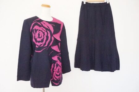 斉藤都世子のニット セットアップを出張買取ご利用のお客様より買取しました。斉藤都世子は「ニットの女王」とも呼ばれるファッションデザイナー。ニットでありつつもエレガントな装いが叶うため冷えを防ぎつつも品のある雰囲気に仕上げてくれます。豪華なバラが印象的なニット。セットアップのため別々で使えるのが嬉しいですね。