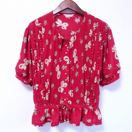 スズランやリボン、ブローチなどゴージャスで可愛い雰囲気の柄が特徴的なブラウス。ブランドはカネコイサオです。出張買取にて買取しました。フリルやパールボタンも相まって可愛らしさ全開で着ていただけます。