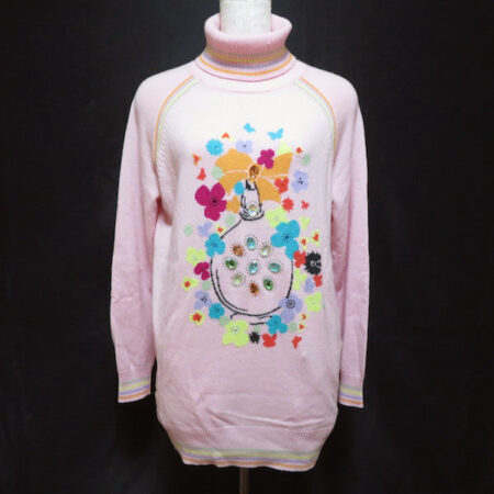 伊太利屋のニットを出張買取ご利用のお客様より買取しました。気持ちを癒してくれるような優しいピンク、カラフルで心ときめくお花柄、所々に散りばめられたビジュー。全てのハーモニーが美しい1枚です。ダークな色に偏りがちな冬の変化球として着ていただきたいですね。