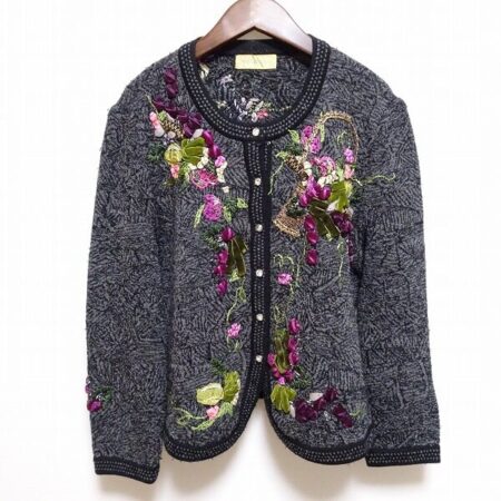 アトリエサガンのカーディガンを出張買取ご利用のお客様より買取しました。サイズはLサイズです。濃いめのグレーに豪華でパキッとはっきりしたお花の刺繍が映える1着。ちょっと羽織るだけで上品かっこいい印象になれます。
