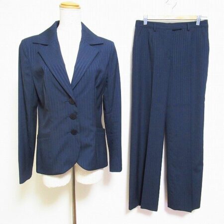 紺の上品さが感じられるハナエモリのパンツスーツ。出張買取ご利用のお客様より買取しました。色っぽさ、カッコよさなど女性が求める要素が全てまとめられた1着ではないでしょうか。デザインも細身でスタイルアップが期待できそうです。